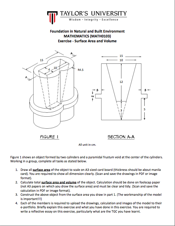In a group of, we are given a task to apply what we have learnt by doing calculation and a model. This hand-on exercise is designed to evaluate our level of understanding towards basic algebra, trigonometry, area and volume. First, we have to determine the total surface area of the object then calculate the volume of the object anf finally construct the model.